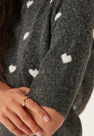 En mørk grå kortermet strikkegenser med rund hals og hvite hjerter i intarsia-mønster over hele genseren. Genseren har ribbestrikkede mansjetter og kant for en behagelig passform.