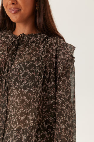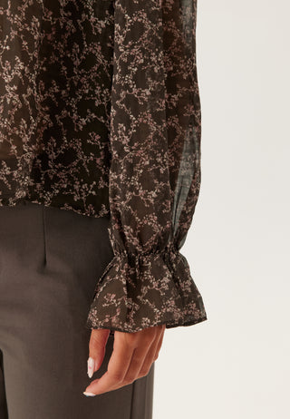 Gjennomsiktig bluse med lange ermer og delikat blomstermønster over hele. Har volangdetaljer på skuldre og mansjetter, rund hals med knyting og avslappet passform. Knepping foran. Lett og luftig stoff.
