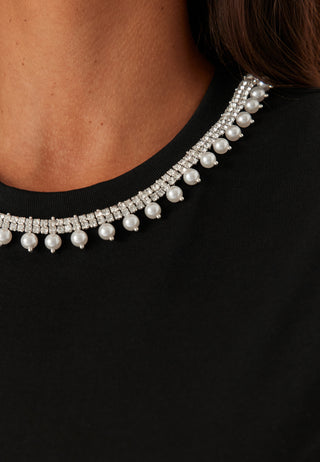 Svart kortermet t-skjorte med rund hals, dekorert med perler og rhinsten langs kragen. Normal passform og hoftelengde. Laget av myk bomull for komfort.
