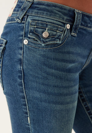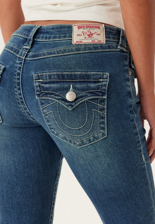 Low rise bootcut jeans i klassisk blå vask. Har signaturklaff baklommer med kontrastsøm og knappdetaljer. Slitte og whiskered effekter foran for en brukt look. Femlommers design med beltehemper og glidelås med knapp. Ikonisk True Religion-merke på linningen.