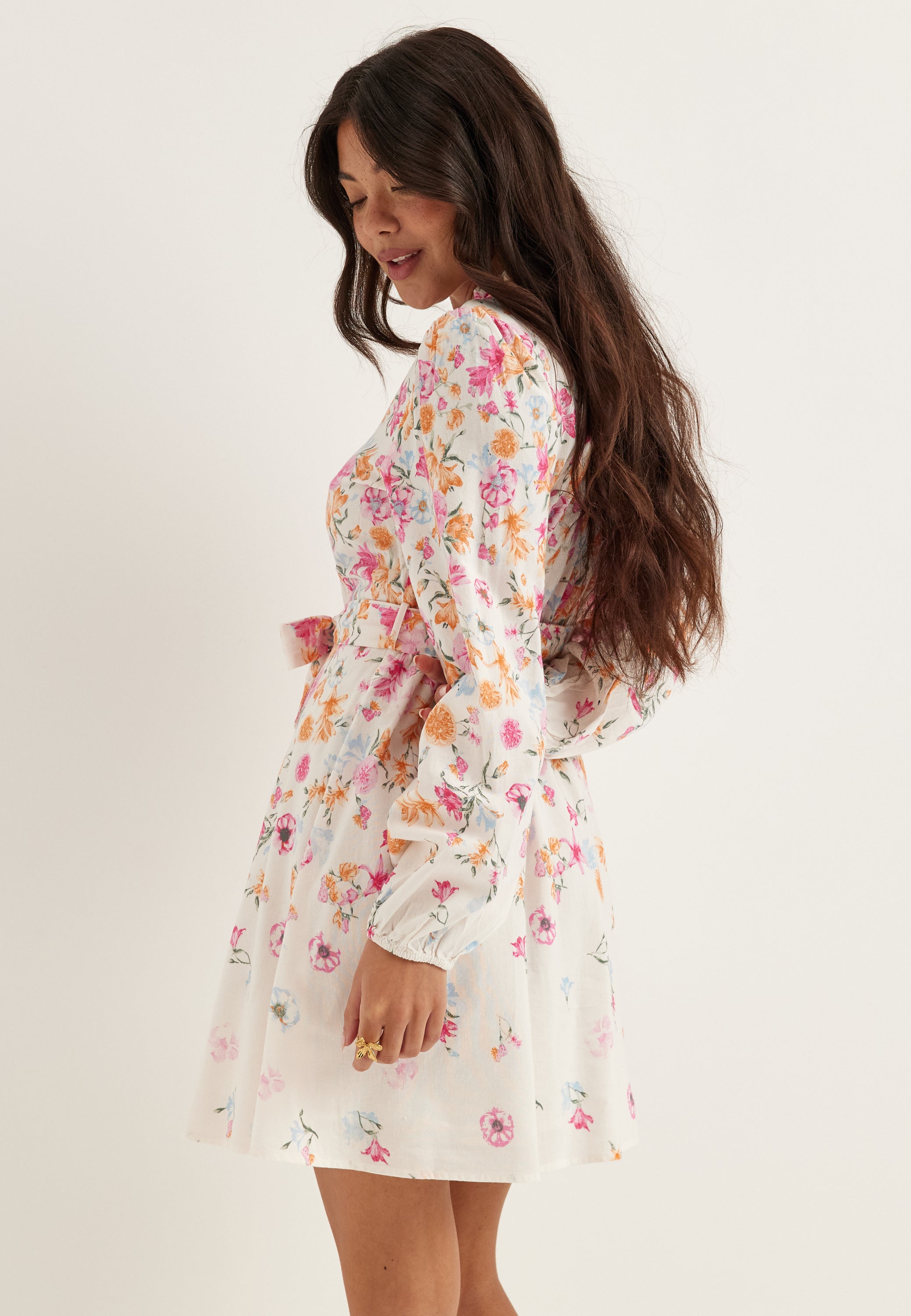 Denne blomstrete minikjolen med lange ermer er et enkelt valg til brunch, hagefester og varme dager når du vil ha noe lett, fint og ukomplisert å bruke. Den er laget i en linblanding med vevd stoff uten stretch, har et mykt fall og en markert midje som gir fin fasong uten å føles for pyntet. Den runde halsen er avsluttet med en liten volangkant som gir et diskret romantisk preg, mens stofftrukne knapper øverst gir fine detaljer foran. Knytebånd i midjen lar deg justere passformen, og strikk bak gjør den behagelig å ha på gjennom hele dagen. Det myke blomsterprintet på en lys bunn gjør at den føles ekstra fresh og enkel å style med sandaler, ballerinasko eller boots. Lengde er 89 cm fra fremre skulder i størrelse 36.