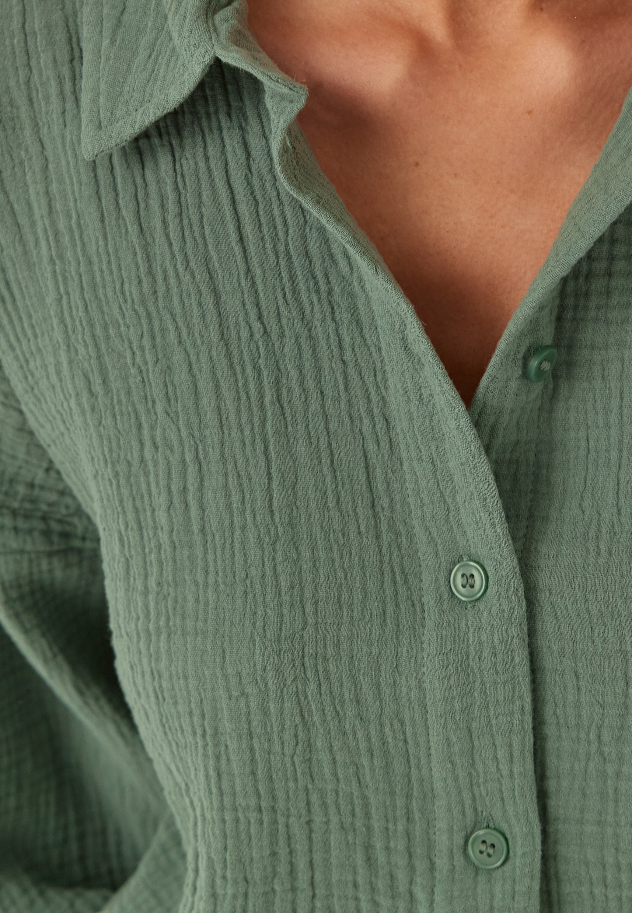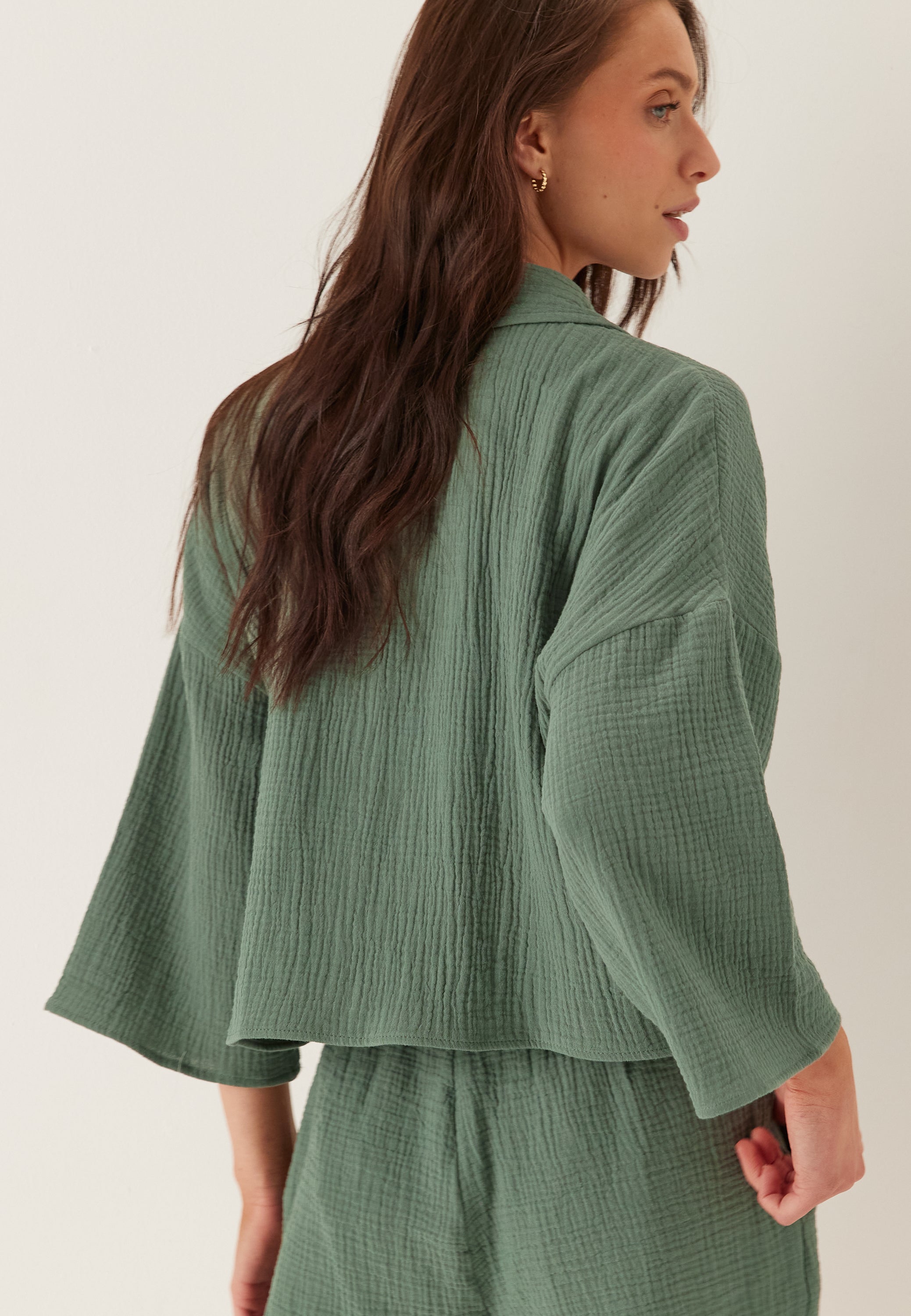 Løs, litt kortere passform med droppet skulder. 3/4 lange ermer. Skjortekrage og knapper foran. Kan brukes sammen som et sett med 718178. Lengde fra frontskulder: 53 cm i størrelse S.