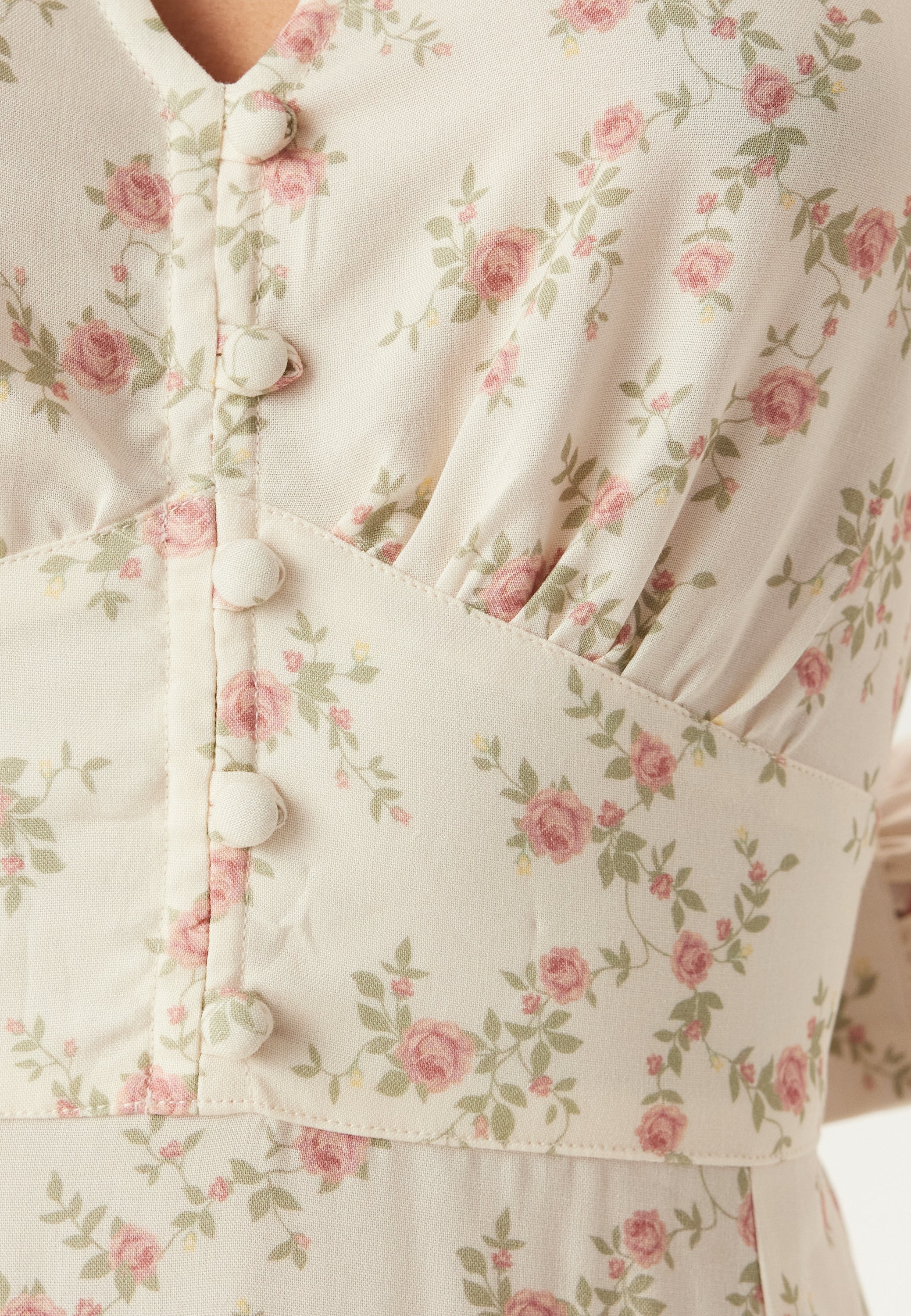 Denne blomstrete maxikjolen har en myk offwhite bunn, en flatterende V-hals og en lang silhuett. Kjolen har markert midje med smock bak for komfort, dekorativ knappestolpe med pynteknapper foran, og lange ballongermer med mansjetter. Laget i vevd LENZING ECOVERO viskose uten stretch, gir den et mykt fall og et velstelt uttrykk. Lengden er 135 cm fra skulderen bak i størrelse 36.