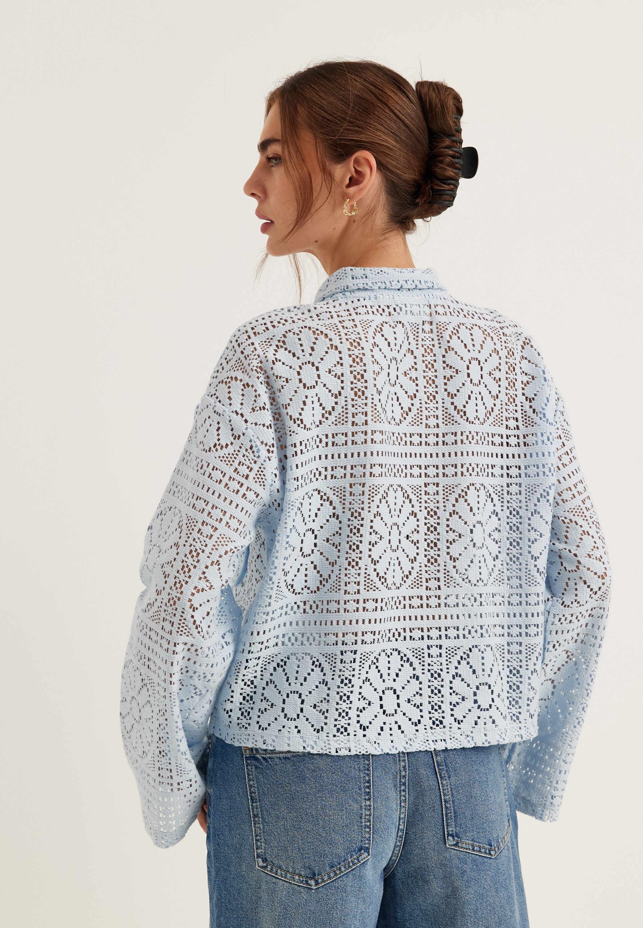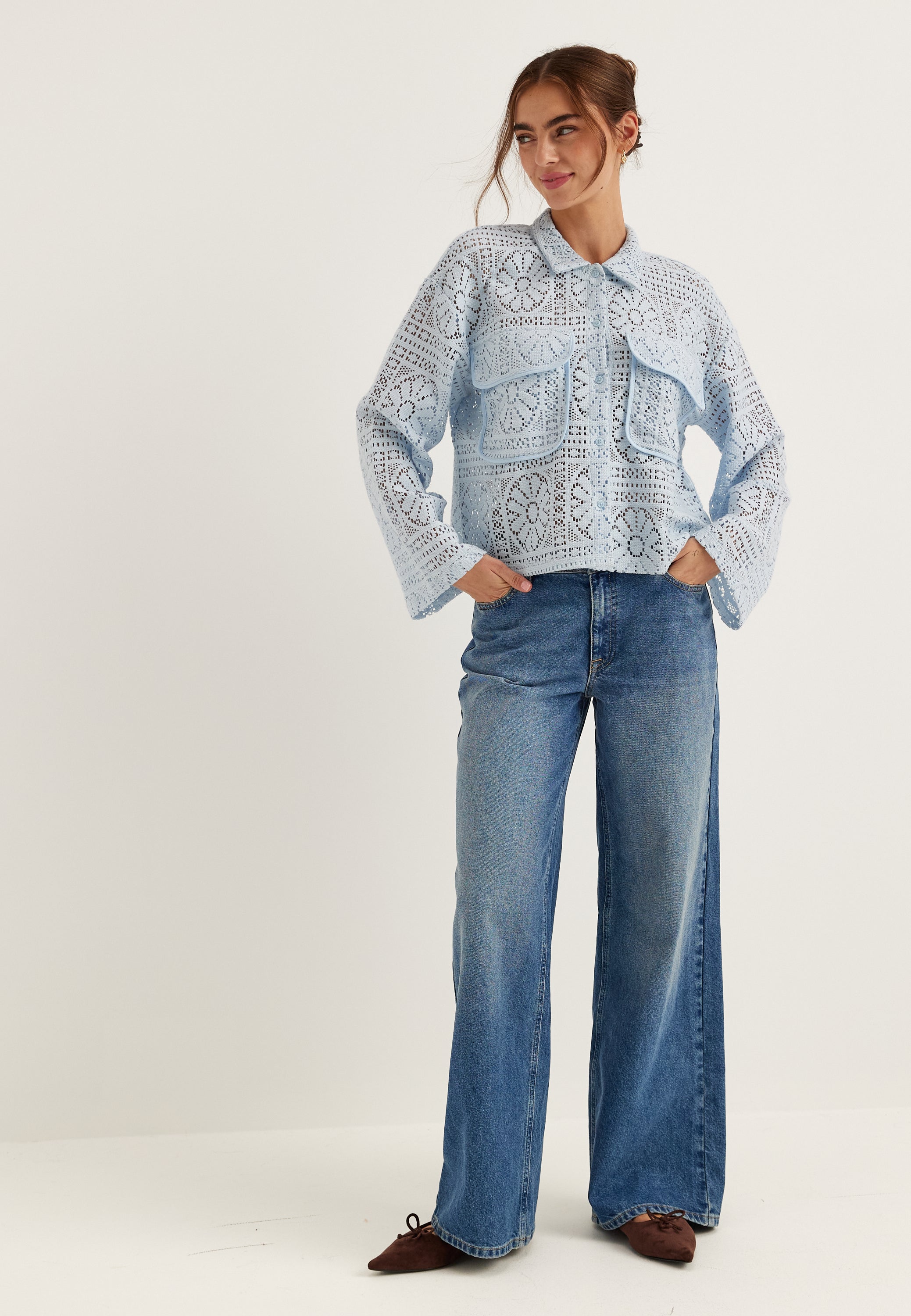 Kardigan fra VILA. Heklet, litt tøyelig materiale, skjortekrage, knappelukking foran, kortere passform og to brystlommer med lokk. Kan brukes sammen som et sett med 722211. Lengde fra frontskulder: 47 cm i størrelse S.