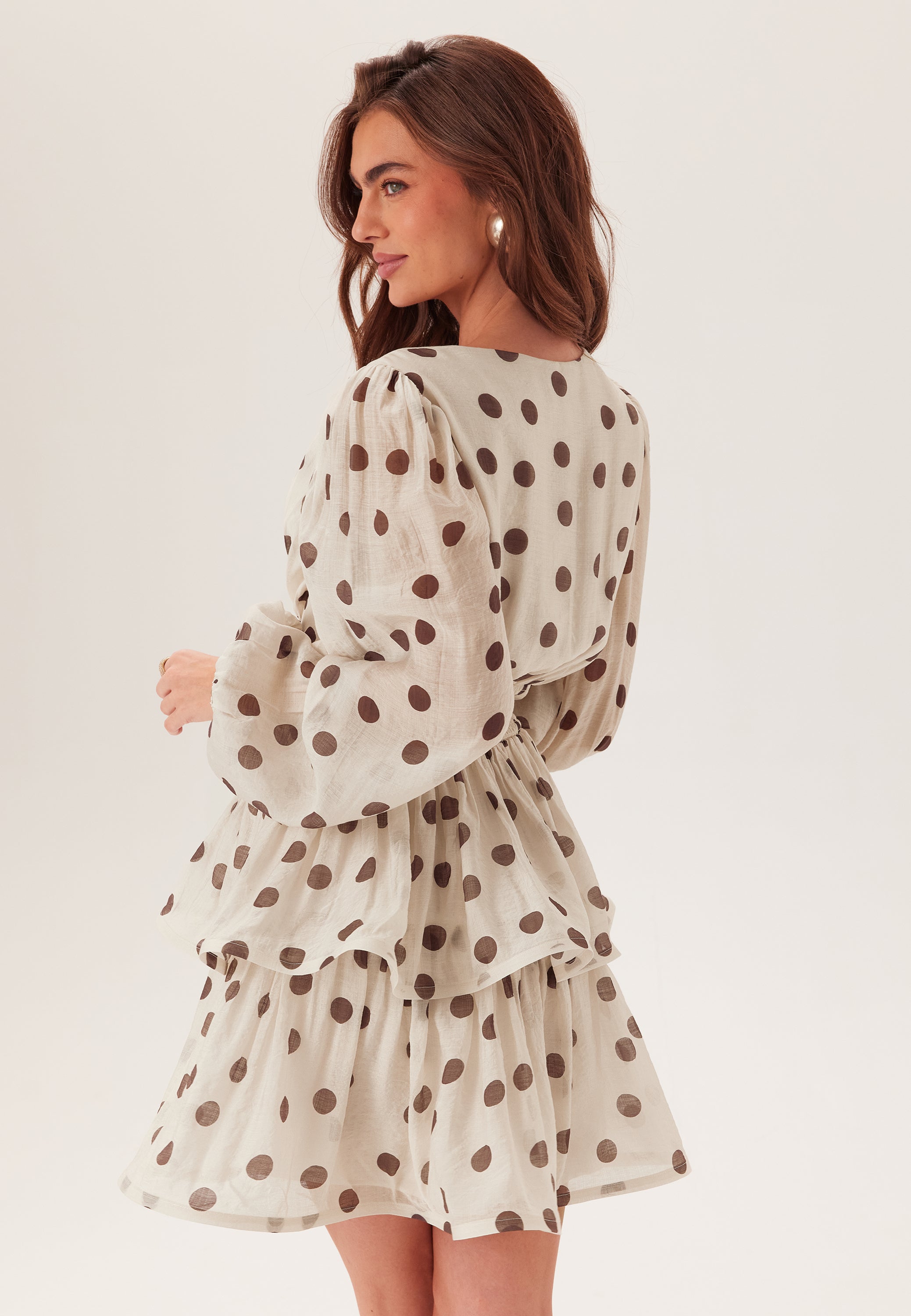 Denne prikkete minikjolen med lange ermer er et enkelt valg til fester, middager og pyntede anledninger når du vil ha noe lekent, men fortsatt velkledd. Den dype V-utringningen, skjørtet med volang og de voluminøse ballongermene gir den fin bevegelse, mens den markerte midjen skaper en flatterende fasong som føles feminin uten å virke for pyntet. Det vevde stoffet uten stretch holder silhuetten lett og strukturert, og kjolen er fôret for ekstra komfort og dekning. Smock bak i midjen gjør at den sitter pent over midten, mens strikk nederst på ermene gir mykt volum og gjør dem behagelige å bruke. Lengde fra skulderen: 89 cm i størrelse S. Laget med LENZING™ ECOVERO™ viskosefibre fra sertifiserte og kontrollerte kilder av tre og tremasse; sertifisert med EU Ecolabel for tekstilprodukter.