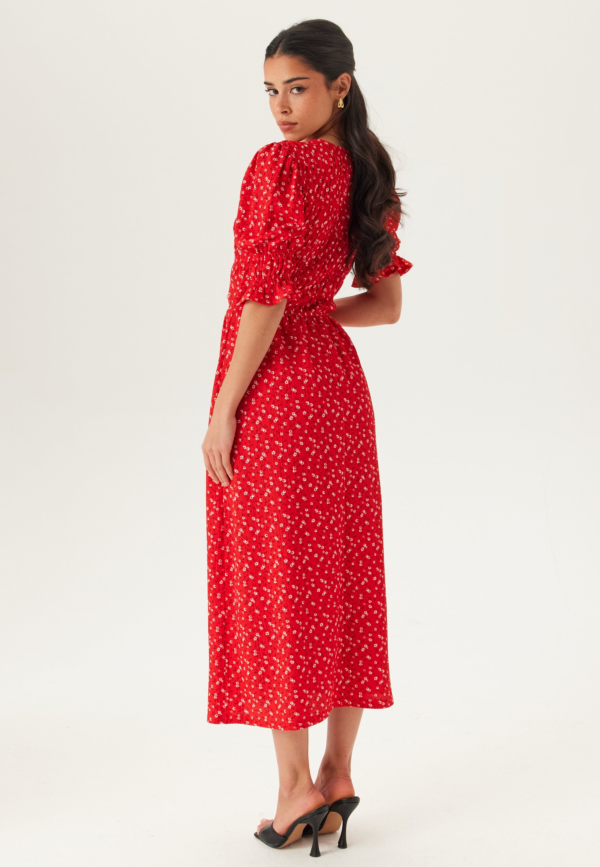 Denne blomstrete smock-midikjolen er en enkel sommerkjole som passer perfekt til planer på dagtid, ferier og avslappede middager når du vil ha noe behagelig som fortsatt ser gjennomført ut. Det myke, stretchy stoffet og den smockede, tettsittende passformen over bysten gir kjolen fin form øverst, mens skjørtet faller løsere for en avslappet følelse og god bevegelsesfrihet. Den runde halsen gir et rent og allsidig uttrykk, og de rynkede skuldrene tilfører litt volum som gjør at den føles litt mer spesiell enn en helt vanlig hverdagskjole. I det klare røde blomsterprintet skiller den seg ut på den beste måten – enkel å bruke med flate sandaler på dagtid, eller style opp med hælede mules til middag. Passform: Smocket, tettsittende passform over bysten. Utringning: Rund hals. Ermer: Korte ermer med rynkede skuldre. Følelse: Myk og stretchy kvalitet. Lengde: 122 cm fra skulderen i størrelse S.