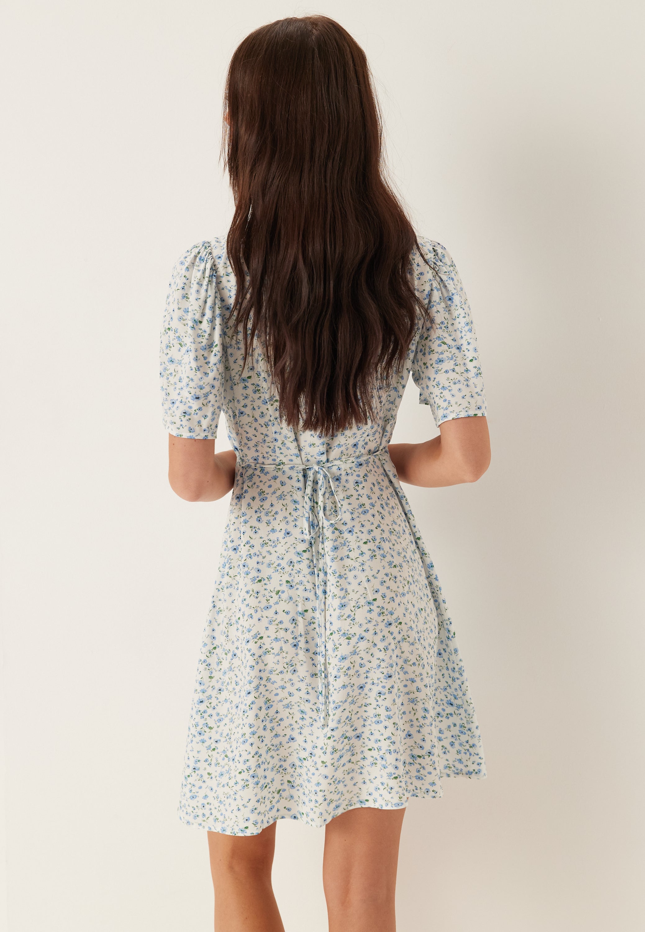 Denne blomstrete minikjolen er en enkel sommerfavoritt til varme dager, helgeplaner og uformelle middager når du vil ha noe lett, fint og ukomplisert å ha på. Det myke blå-hvite printet gir den et friskt hverdagsuttrykk, mens V-utringningen, knappene foran og knytebeltet i livet gir en flatterende fasong uten at det føles for pyntet. Laget i et vevd stoff uten stretch, har den et fint fall som holder uttrykket ryddig og lett. De korte ermene gir litt lett dekning, og lengden på 89 cm målt fra fremre skulder i størrelse S gjør at den helt klart er en minikjole. Den er laget med LENZING™ ECOVERO™-viskosefibre, utvunnet fra tre og tremasse fra sertifiserte og kontrollerte kilder, og sertifisert med EU Ecolabel for tekstilprodukter.