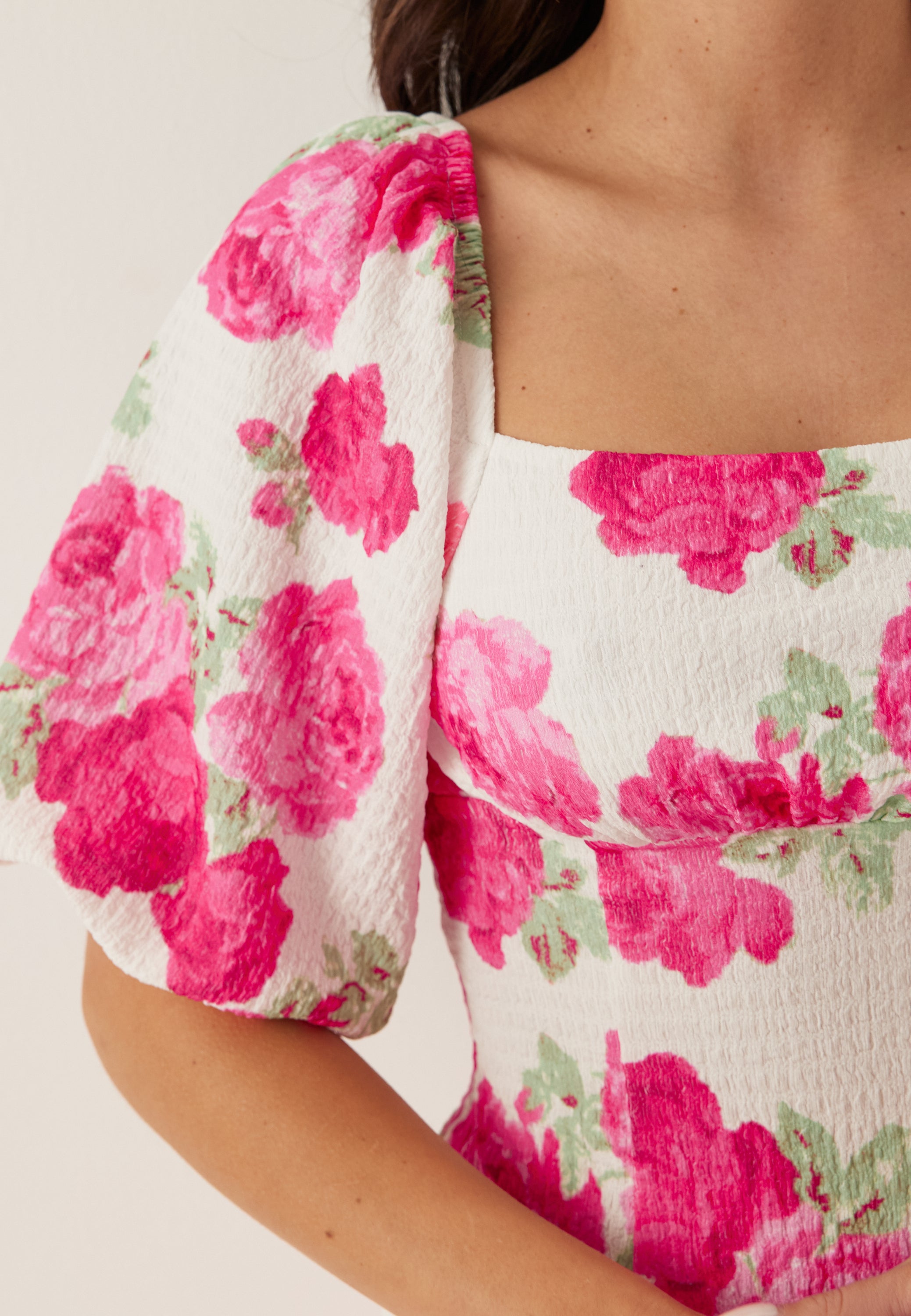 Denne blomstrete midikjolen har en tettsittende overdel, firkantet utringning og myke volumermer. Kjolen har et klart rosa rosemønster på en lys base og et løsere skjørt for en avslappet look. Toppen sitter tett for en definert silhuett, med smock bak for fleksibilitet og komfort over bysten. Den fôrede overdelen gir ekstra dekning, og den teksturerte kvaliteten gir kjolen mer dybde. Kjolen har tettsittende overdel og løst skjørt, firkantet utringning, korte fluffy volumermer, smock-detalj bak og måler 110 cm fra skulderen i størrelse S.