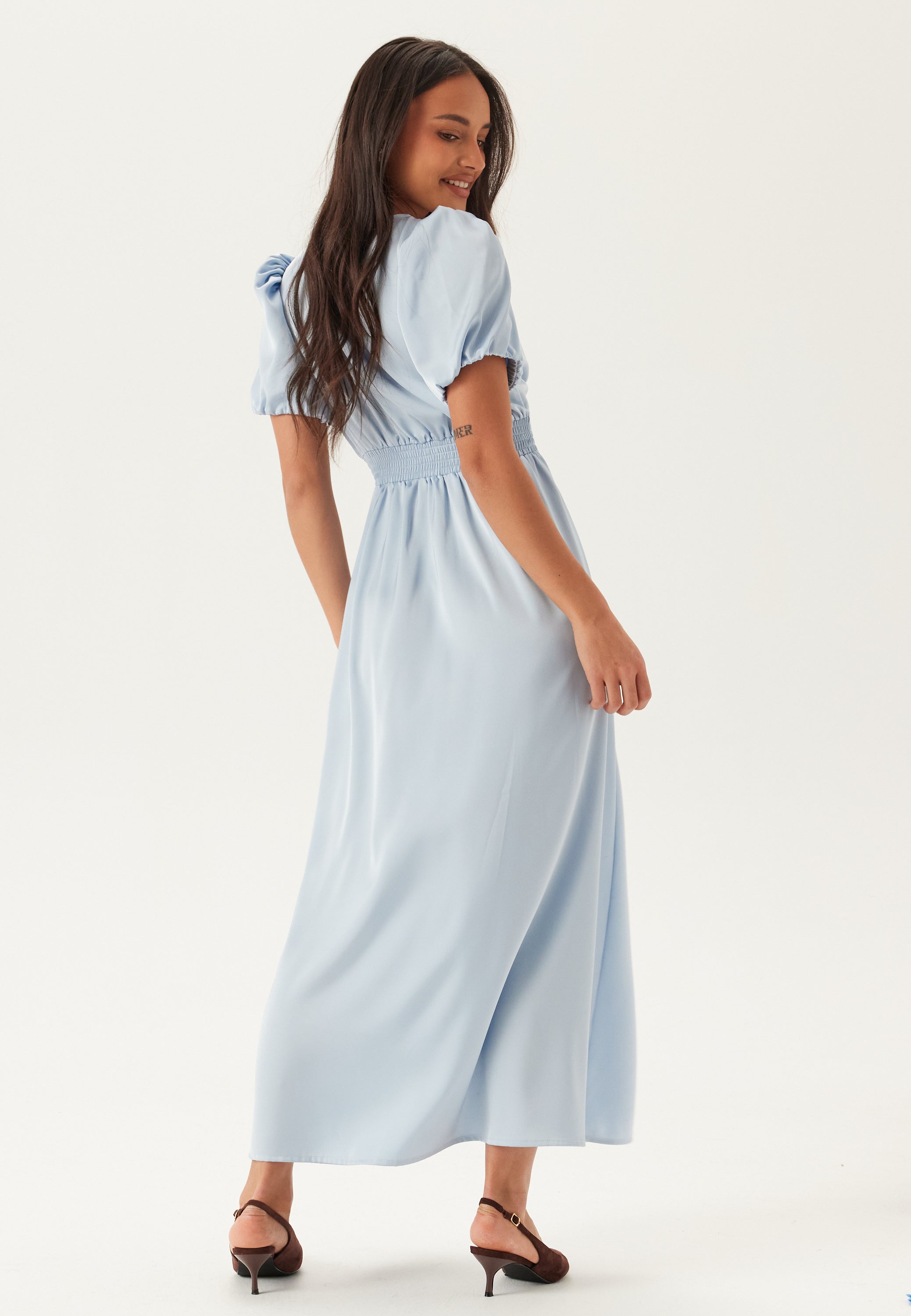 Denne sateng-maxikjolen i støvet blå er et enkelt valg til bryllup, fest og andre anledninger der du vil kle deg litt ekstra fint, men fortsatt føle deg myk, flatterende og komfortabel hele kvelden. Den tettsittende passformen over overdelen balanseres fint av et A-formet skjørt, mens V-utringningen og de korte puffer ermene gir et romantisk og velstelt uttrykk. Det vevde satengstoffet har en glatt overflate som fanger lyset og gjør at denne maxikjolen føles litt mer spesiell enn det du vanligvis bruker til fest. Smock bak gir en mer fleksibel passform, og knappedetaljene foran trekker blikket inn mot midjen og gir en fin fasong. Uten fôr for en lettere følelse, beveger den seg fint og har en lengde på 135 cm fra skulderen i størrelse 36.